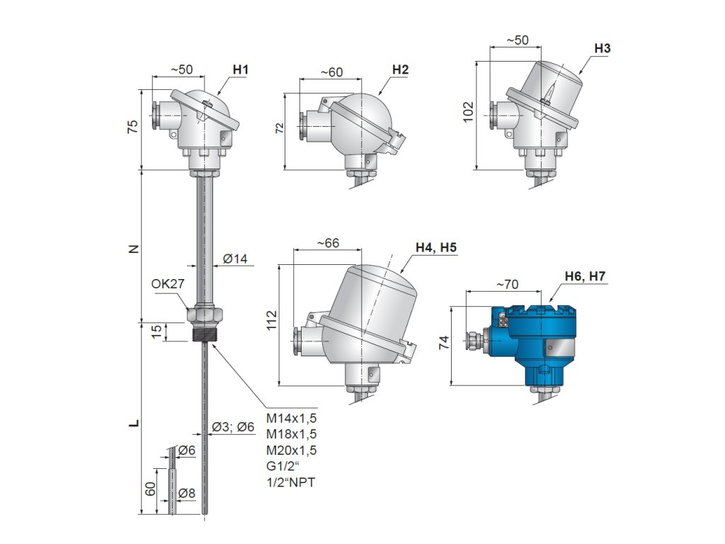 Snímače mohou být dodány s připojovací svorkovnicí nebo s převodníkem s výstupem 4 až 20 mA, případně HART, Profibus, Fieldbus umístěným v hlavici snímače.