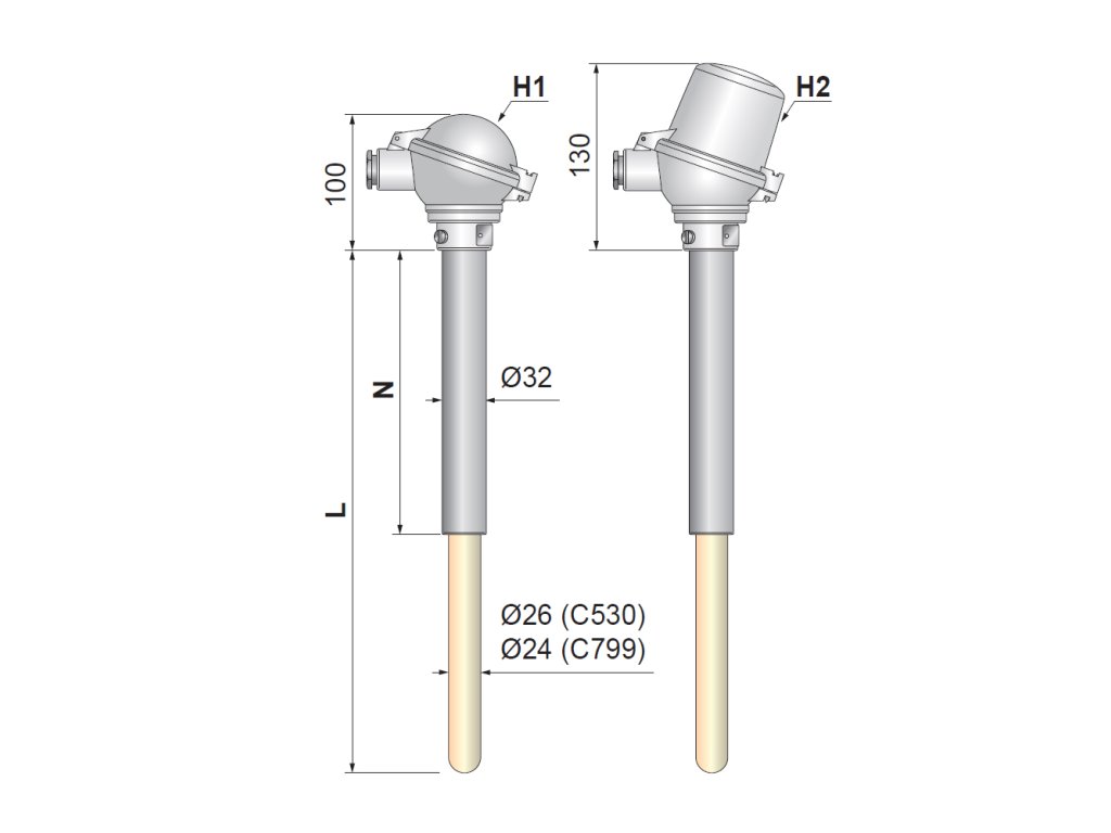 Vlastnosti produktu T1580 C24SF/C26SF Termoelektrické snímače teploty s keramickou a safírovou ochrannou trubkou CeraTEMP® 80