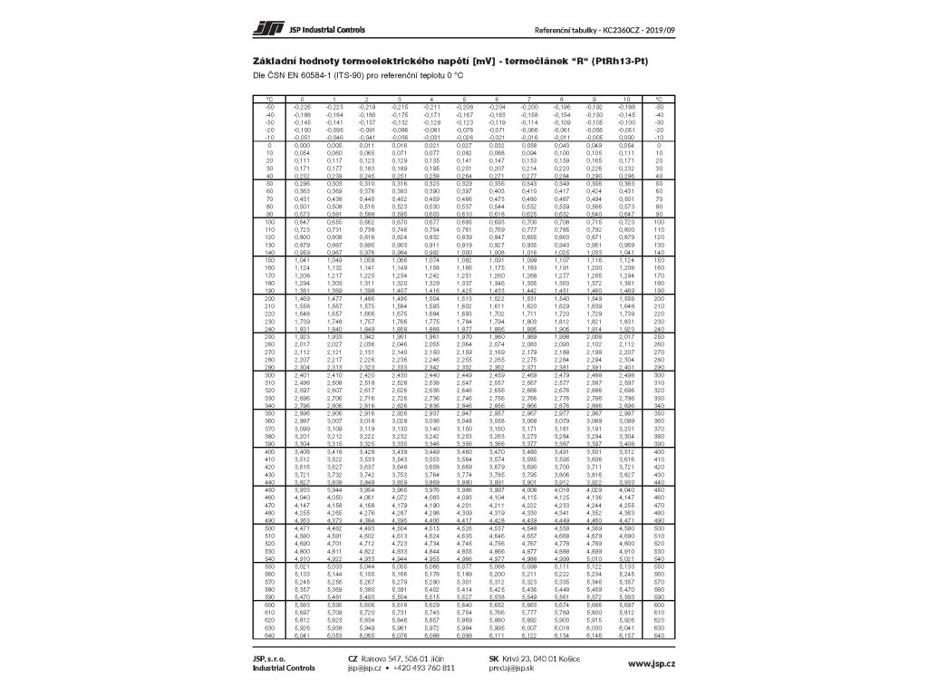 Základní hodnoty termoelektrického napětí [mV] dle ČSN EN 60584-1 (ITS-90) pro referenční teplotu 0 °C.