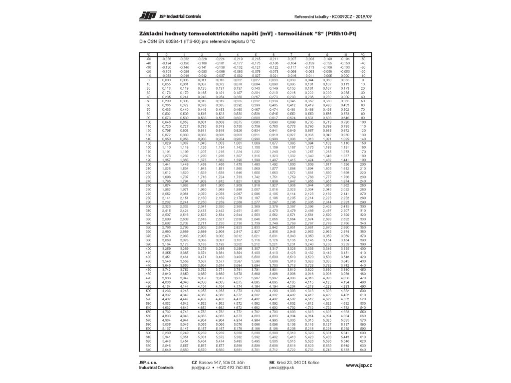 Termočlánek "S" (PtRh10-Pt) ref. tabulka